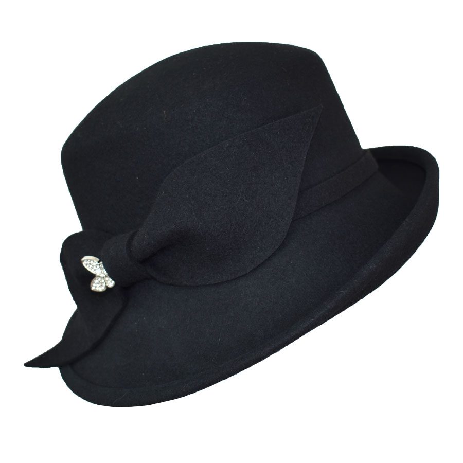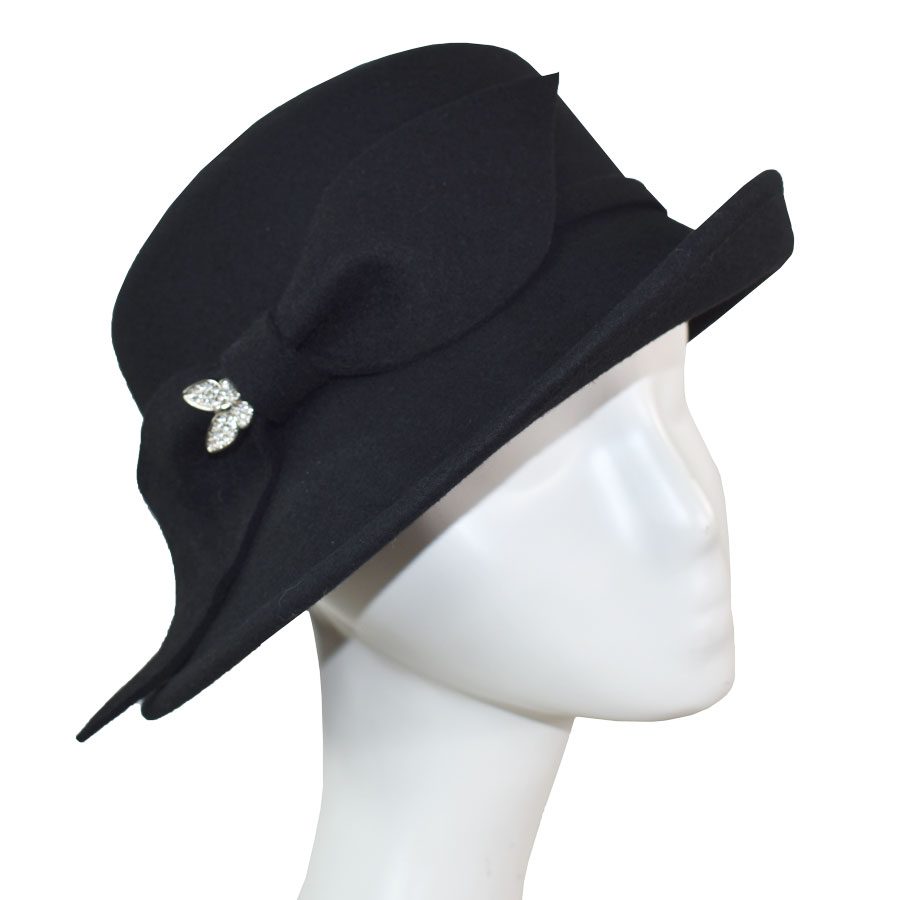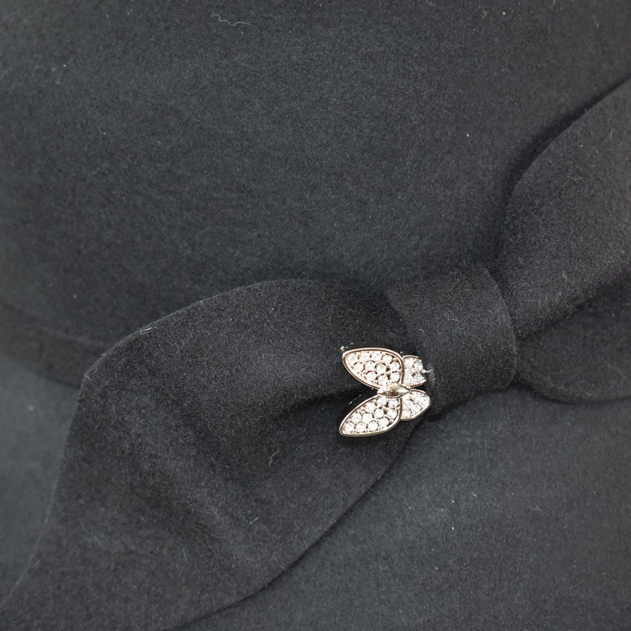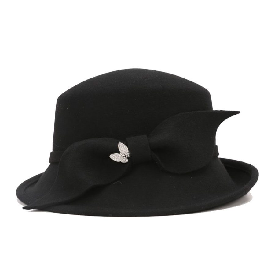 Refined yet full of personality, this cold-weather hat pairs a softly structured asymmetrical brim with a sleek side bow and slender band for a silhouette that flatters from every angle. A rhinestone butterfly pin adds a hint of sparkle, bringing a playful, feminine edge to its vintage-inspired shape. Designed with comfort in mind, a hidden adjustable elastic tie beneath the sweatband ensures a secure, custom fit. Comes complete with a complimentary hat bag to protect your piece—whether you’re storing it at home or taking it on the road.