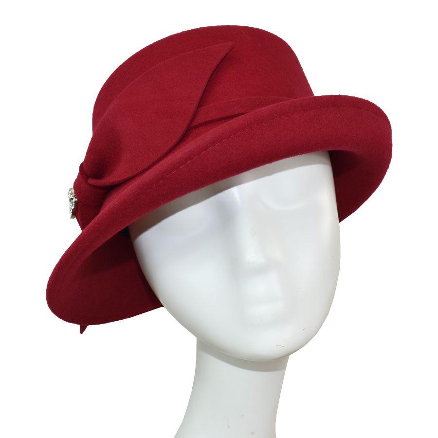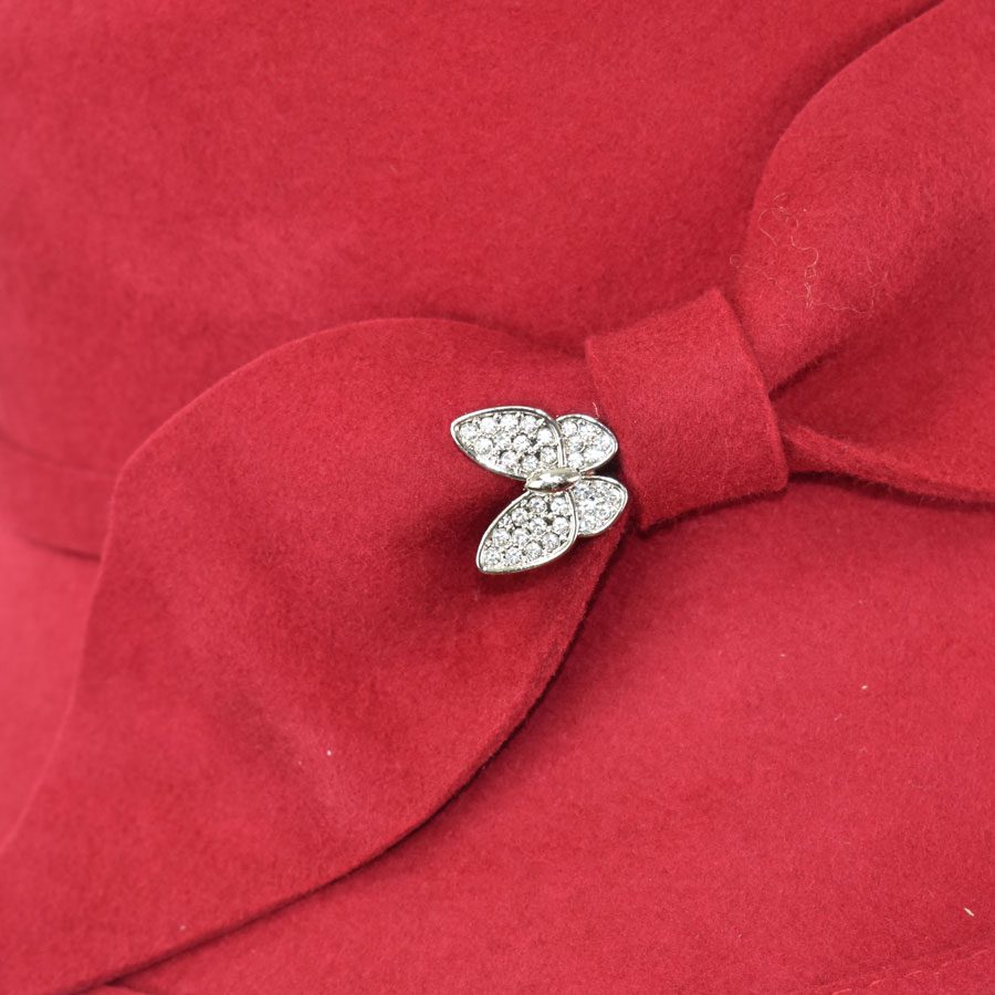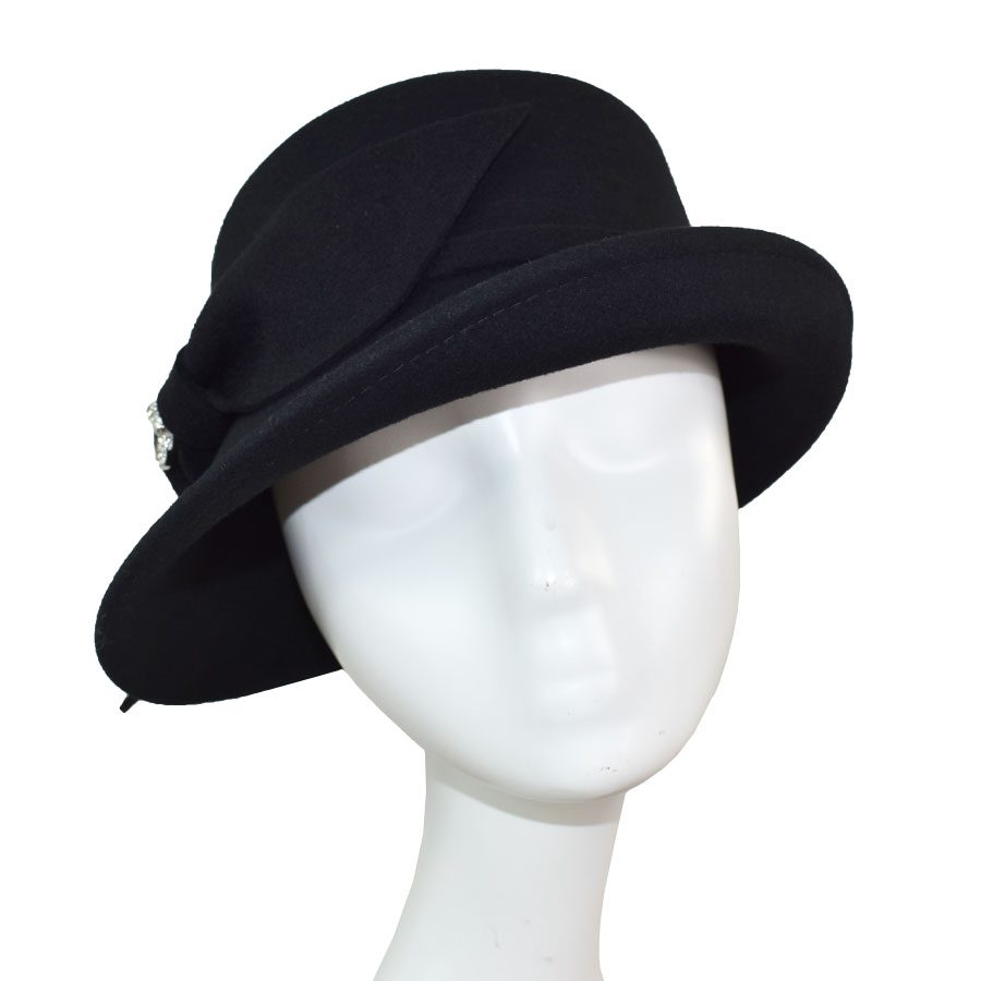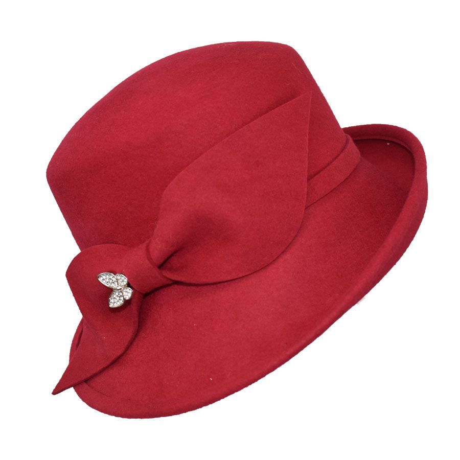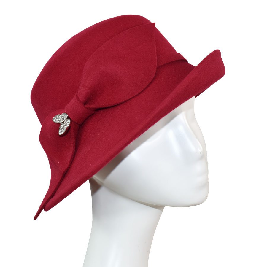 Refined yet full of personality, this cold-weather hat pairs a softly structured asymmetrical brim with a sleek side bow and slender band for a silhouette that flatters from every angle. A rhinestone butterfly pin adds a hint of sparkle, bringing a playful, feminine edge to its vintage-inspired shape. Designed with comfort in mind, a hidden adjustable elastic tie beneath the sweatband ensures a secure, custom fit. Comes complete with a complimentary hat bag to protect your piece—whether you’re storing it at home or taking it on the road.